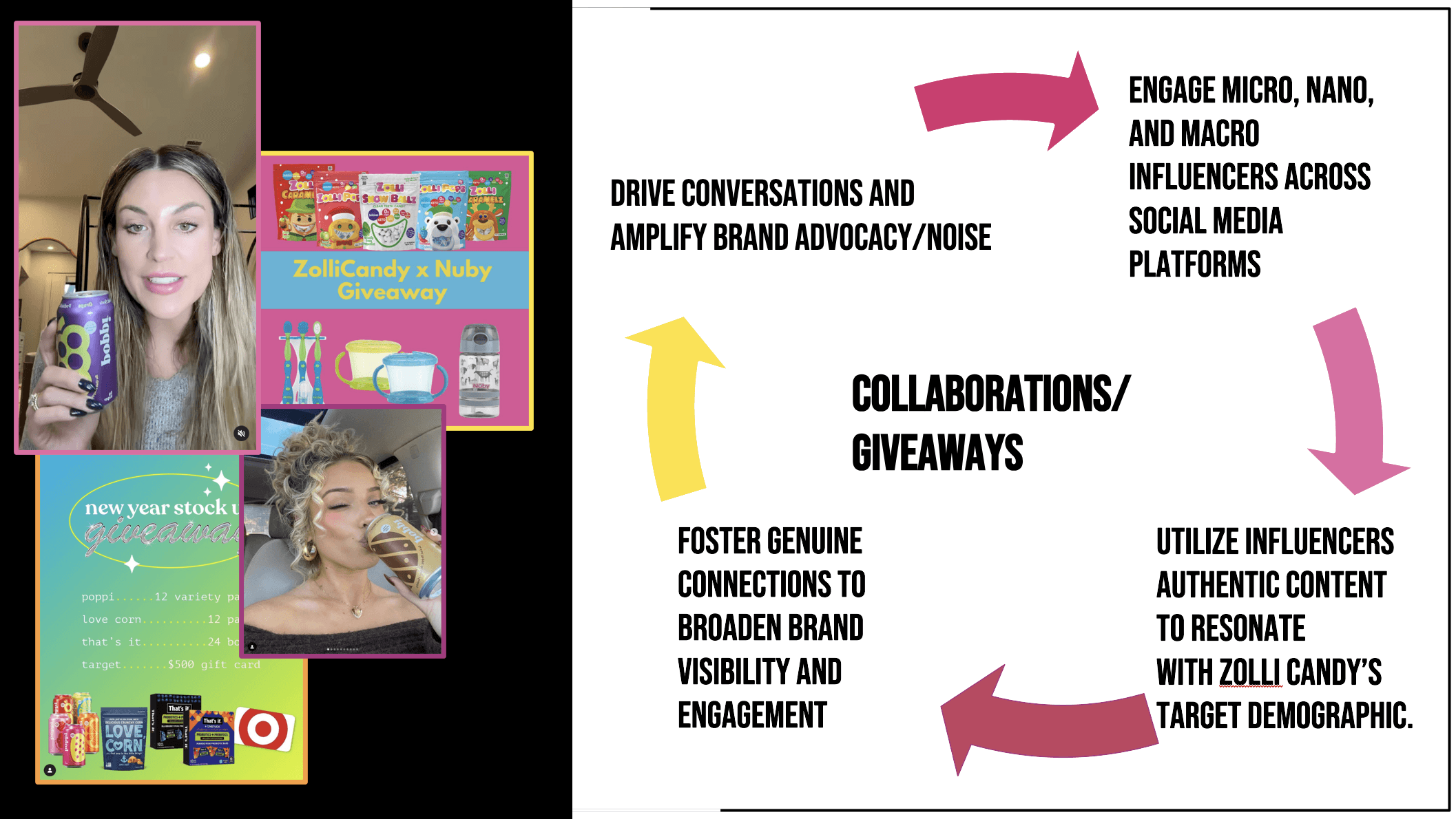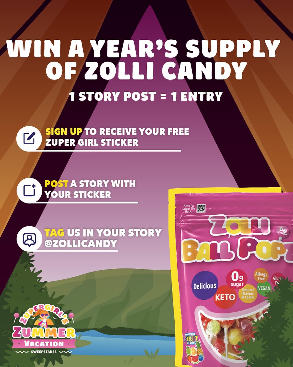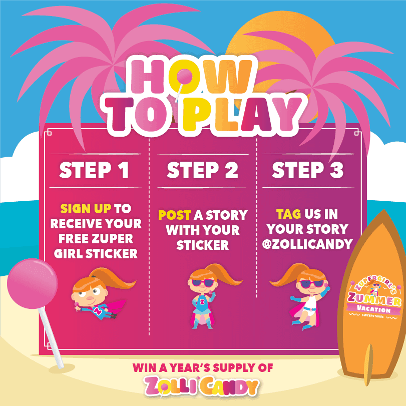 Zolli Candy, a leading sugar-free candy brand, is renowned for its top-selling lollipops on Amazon and availability in over 25,000 stores. Despite its success, the brand faced low audience engagement and needed a campaign that revitalized their brand image with a clear call-to-action. To address this, I developed a summer sweepstakes featuring a new brand mascot designed to drive user generated content, engaging health-conscious millennial moms who prioritize dental-friendly products for their kids.